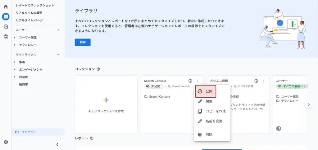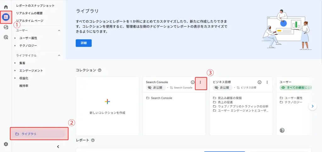 「レポート>ライブラリ」と進みコレクション内Search Consoleの縦三点リーダーを選択します。