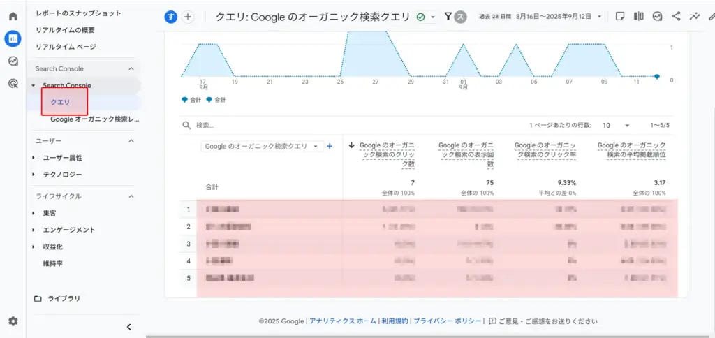 連携後は「集客 > Search Console > クエリ」から、 どの検索語で表示・クリックされたか、CTRや平均掲載順位を確認できます。